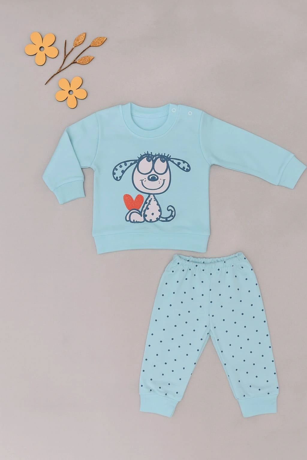 Miniklerin rahatlığı için tasarlanmış bu 2’li takım, yumuşacık dokusu ile gün boyu konfor sağlar. Üst kısmındaki sevimli köpek baskısı ve kalp detayı ile enerjik bir görünüm sunarken, alt kısmındaki minik puantiyeler modern bir dokunuş katar. Günlük kullanım, ev içi rahatlık veya oyun zamanı için idealdir.