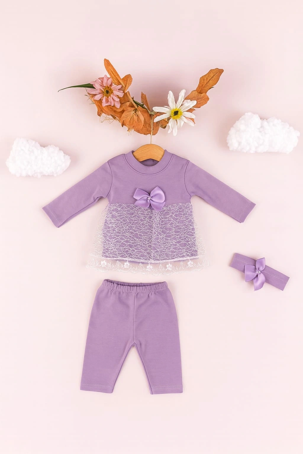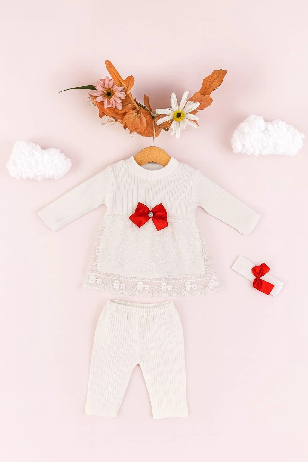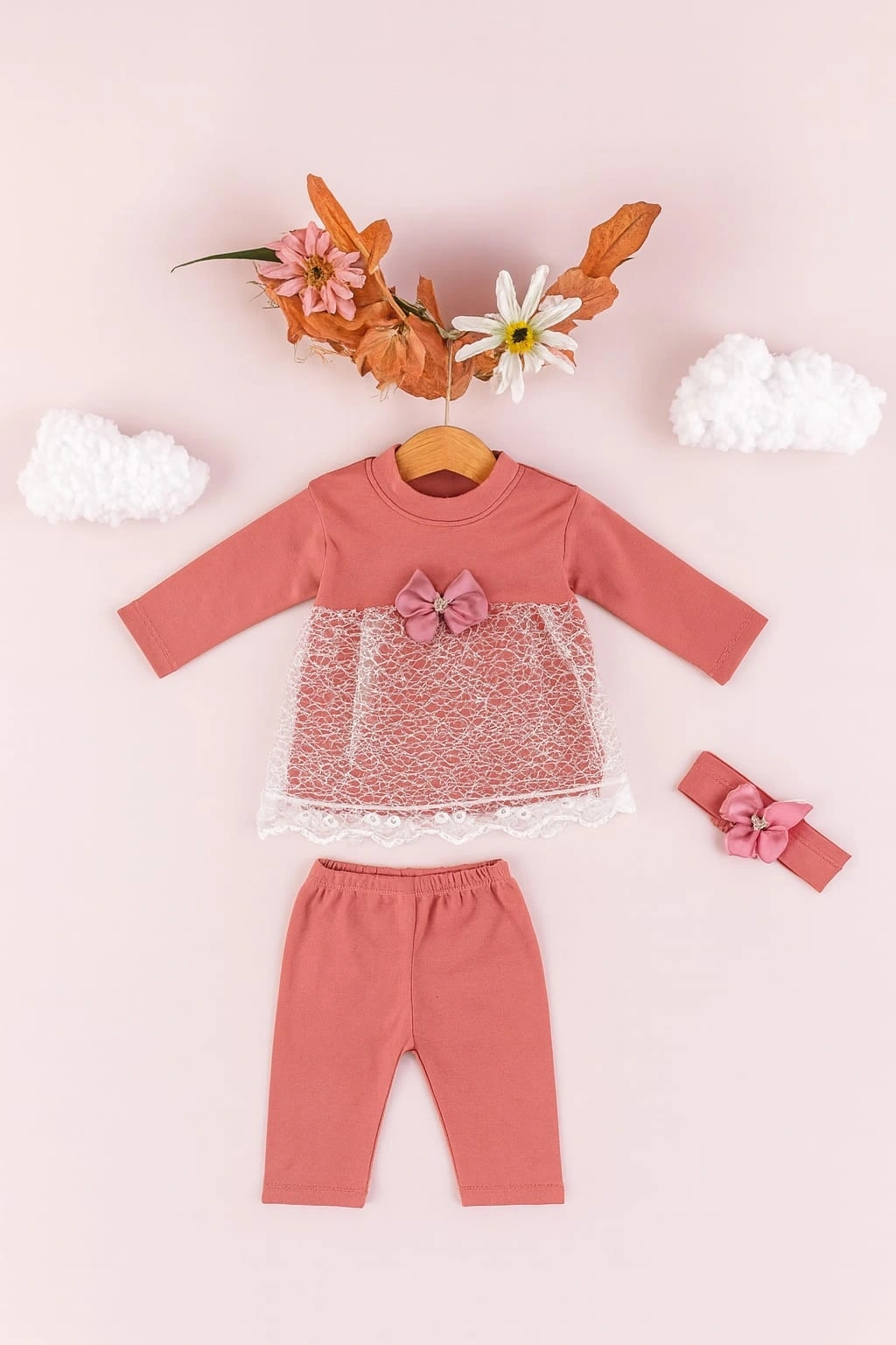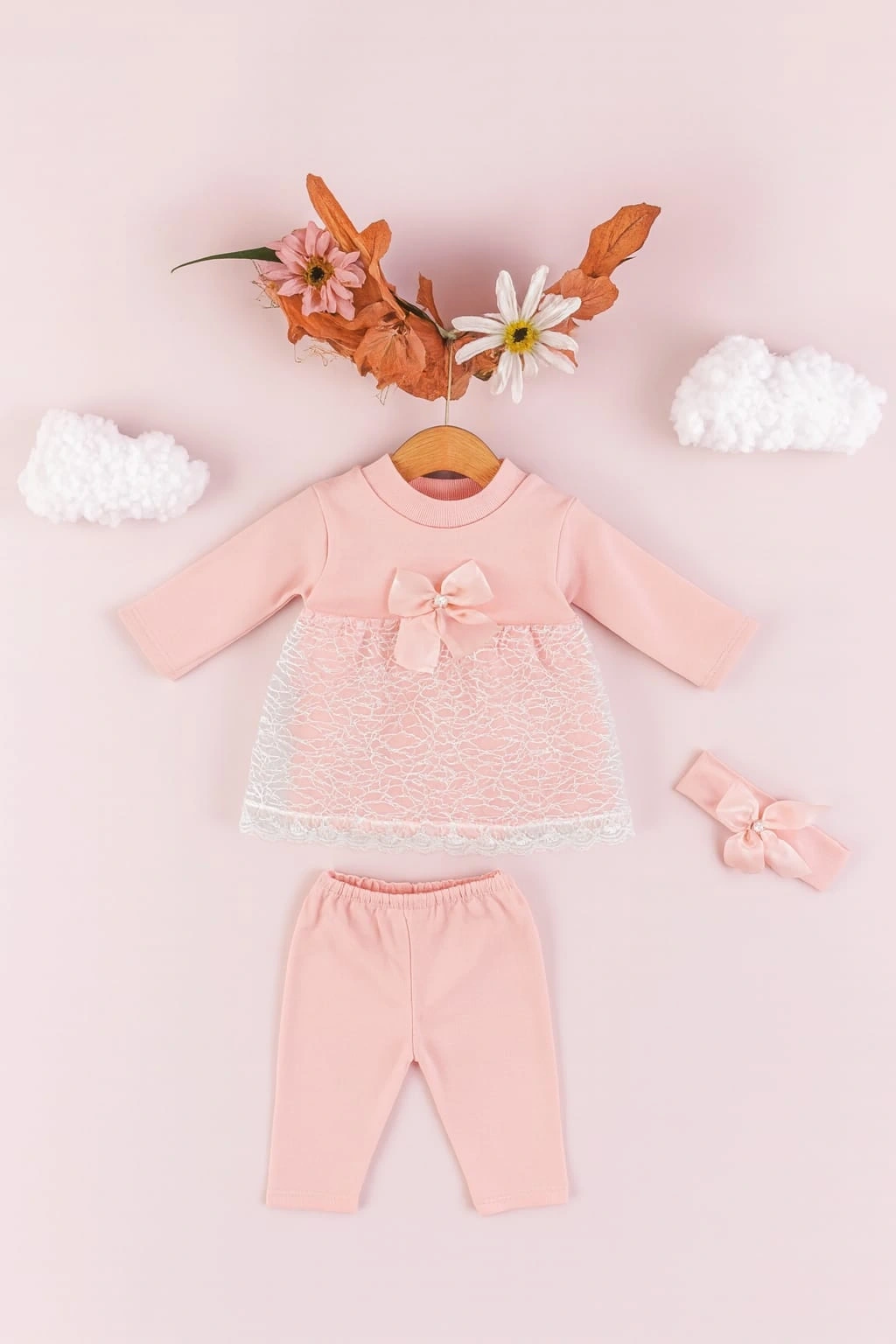 Minik prensesler için zarafet ve konforu bir araya getiren bu 3’lü takım, %100 pamuk kumaşıyla bebeğinizin hassas cildine nazik bir dokunuş sunar. Takım; dantel detaylı uzun kollu elbise, esnek bel yapısına sahip tayt ve fiyonklu saç bandından oluşur. Üst kısmındaki zarif fiyonk detayı ve dantel işlemeler, sade şıklığıyla öne çıkar. Günlük kullanımda veya özel günlerde rahatlıkla tercih edilebilir.