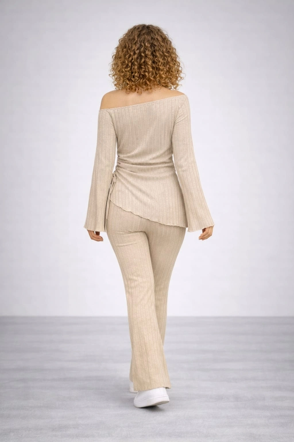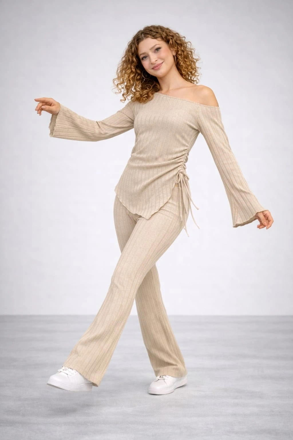 Takımın üst parçası, omuzları zarifçe ortaya çıkaran madonna yaka (kayık yaka) kesimi ve bileklere doğru genişleyen modern İspanyol kol tasarımıyla feminen bir duruş sergiler. Yan kısmında bulunan ayarlanabilir büzgü ve bağlama detayı, bluzun boyunu dilediğiniz gibi ayarlamanıza olanak tanır; ister büzerek crop tarzında, ister serbest bırakarak tunik formunda kullanabilirsiniz.