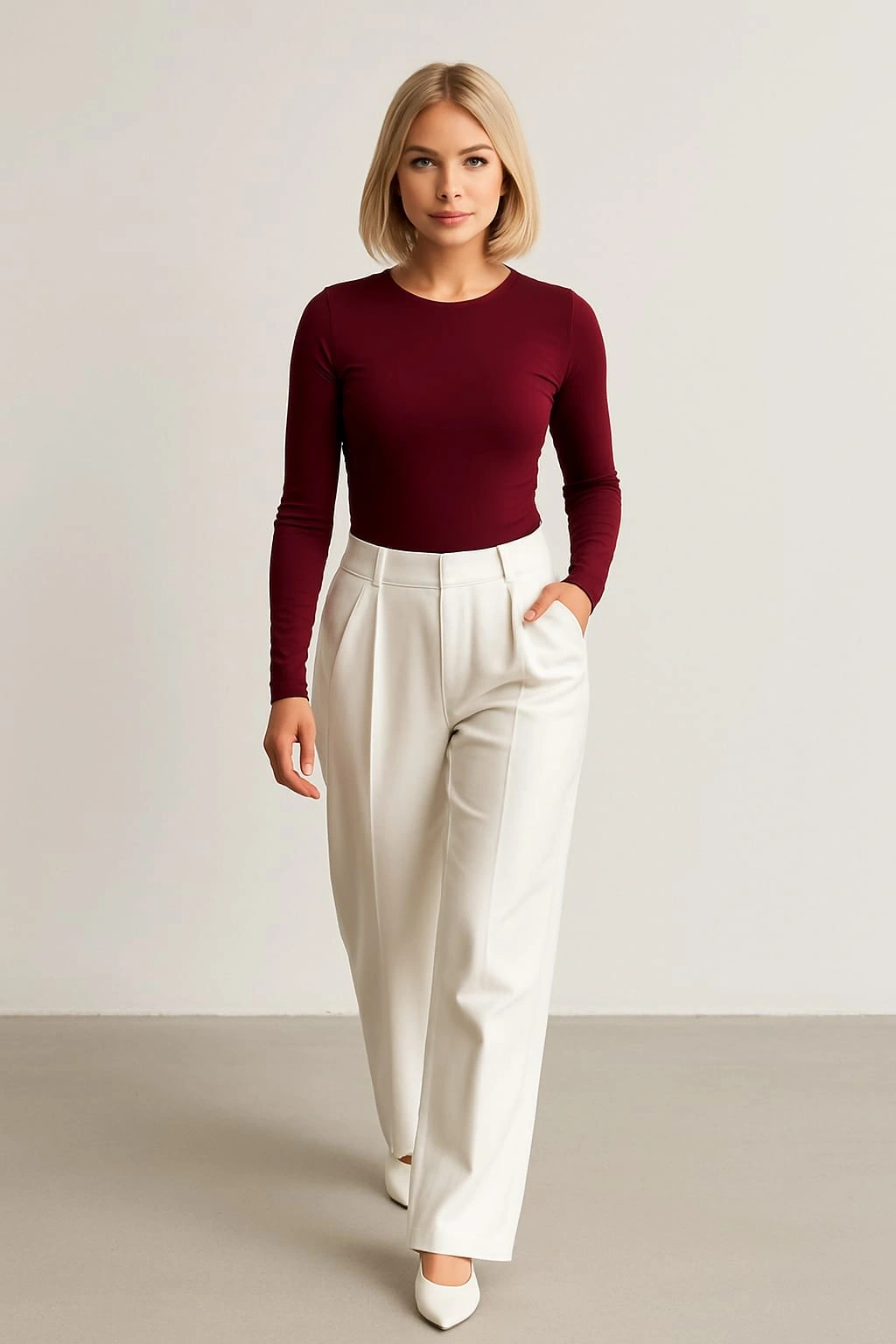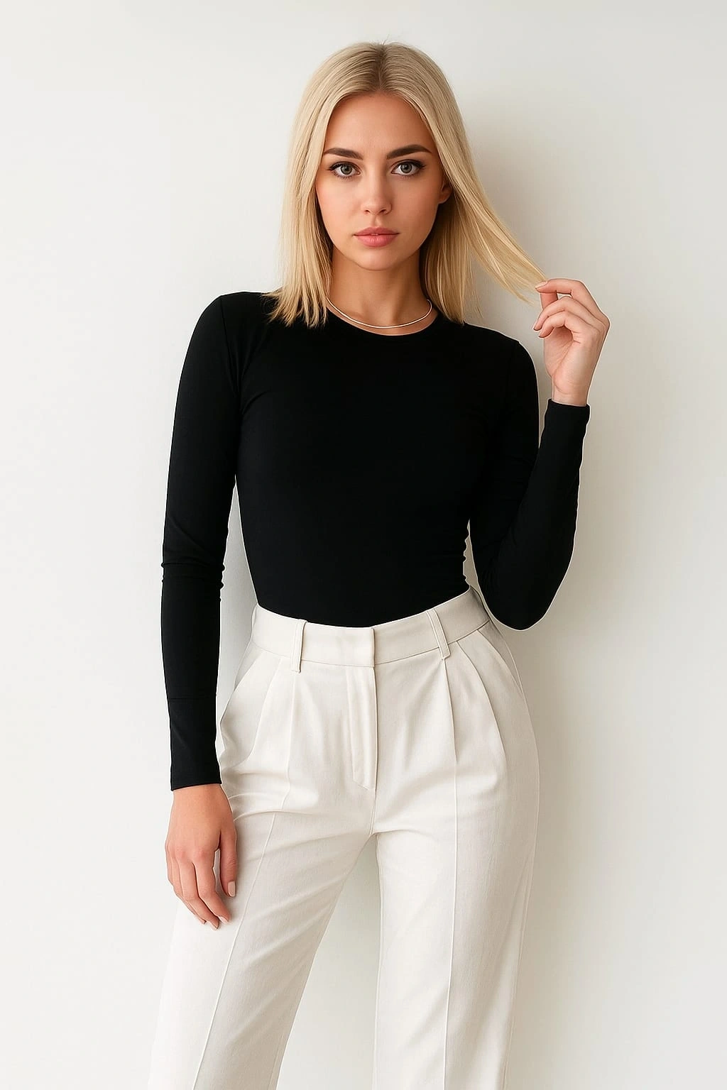 Crop değildir; standart uzunluktadır ve pantolon, etek veya ceketlerle rahatça kombinlenebilir.