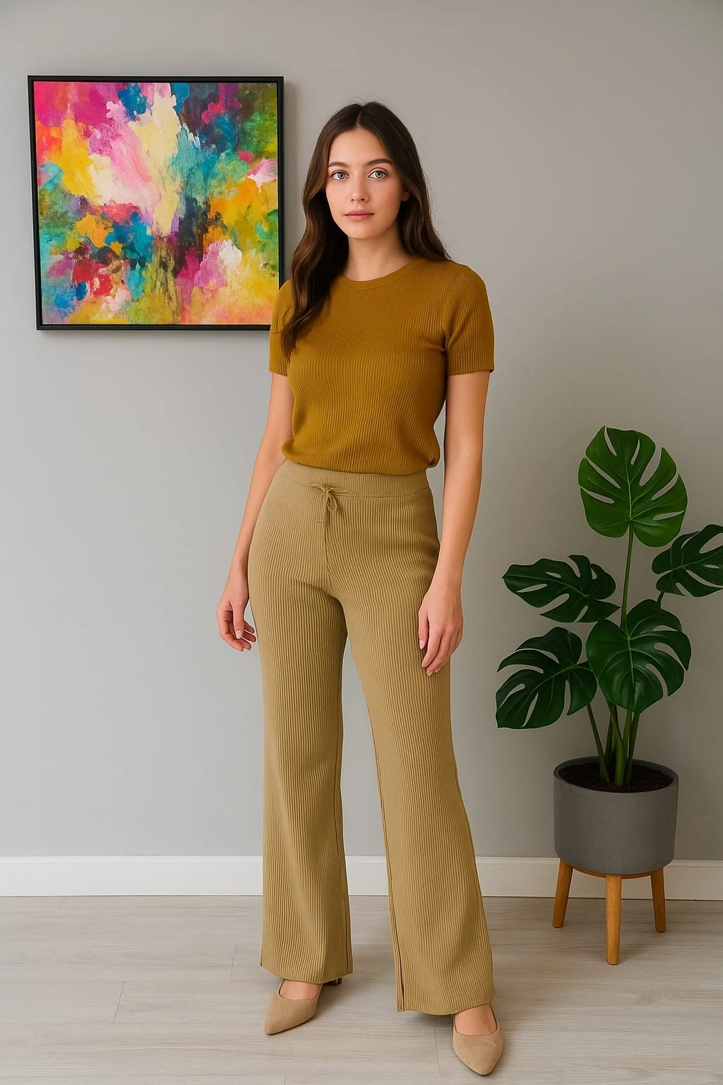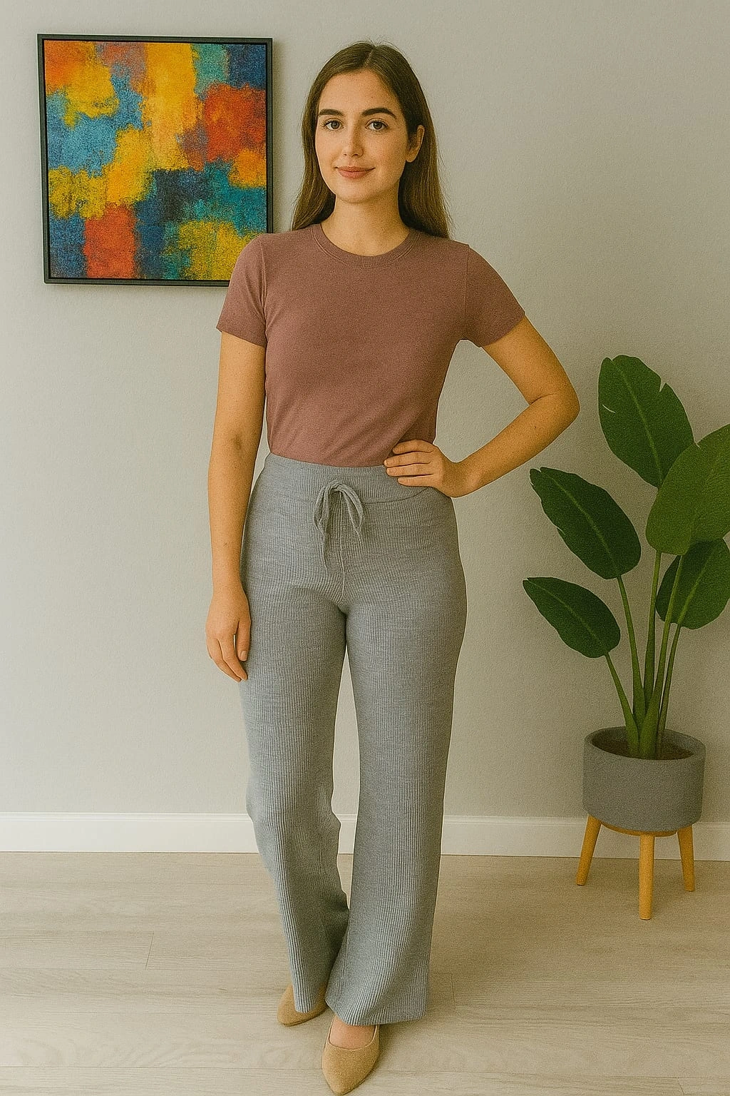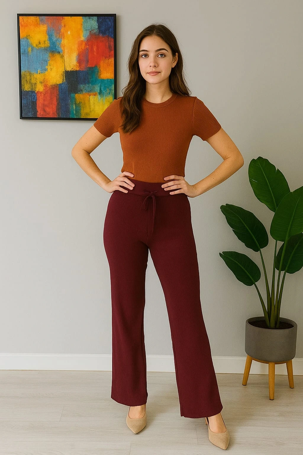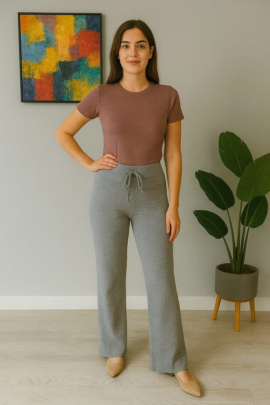 Yumuşak dokusu ve esnek yapısı ile gün boyu konfor sağlayan bu triko pantolon, sade ve şık tarzı bir araya getiriyor. Yüksek bel kesimiyle vücudu zarifçe sarar, beldeki bağcık detayı ise hem estetik hem de pratik bir dokunuş sunar. Günlük kombinlerde rahatlıkla kullanılabilir, ister basic tişörtlerle ister gömleklerle kolayca tamamlanabilir.
