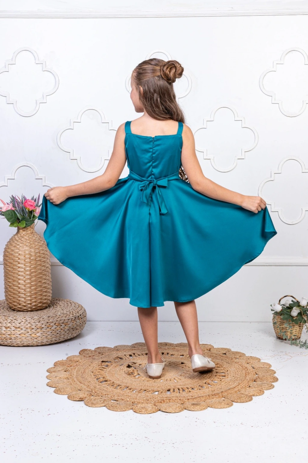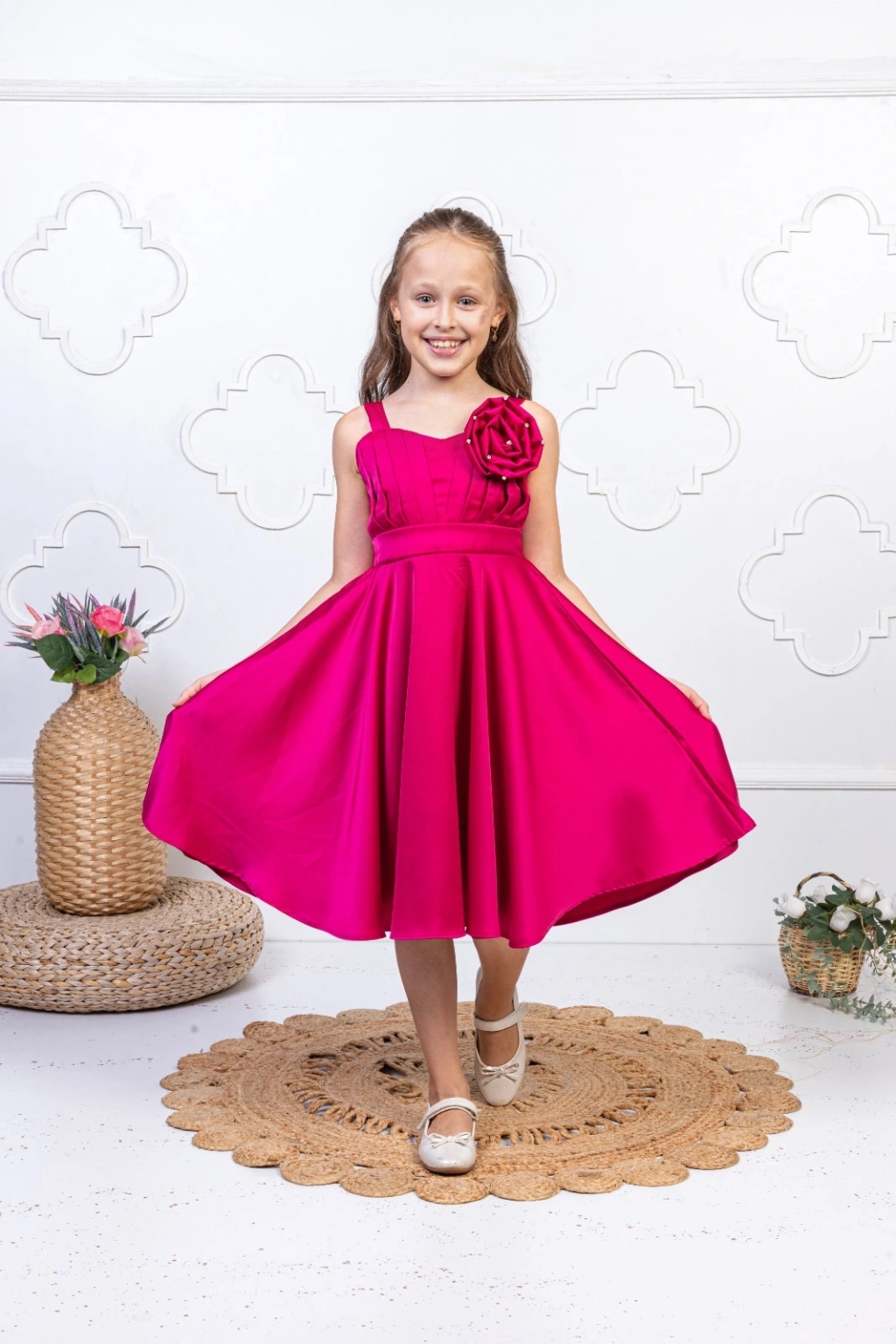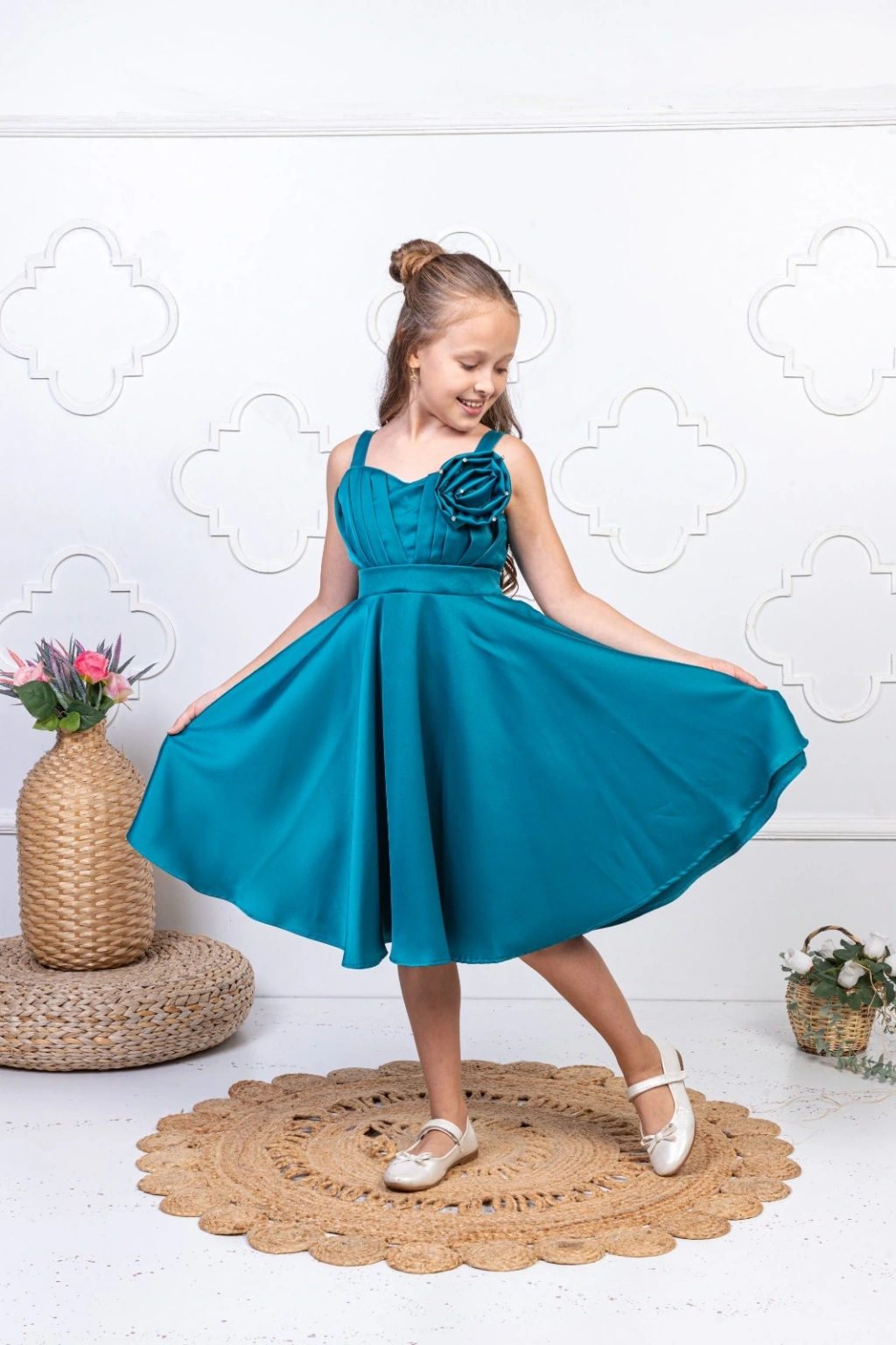 Kız çocukları için özel günlerde şıklığı ön plana çıkaran abiye elbise modelidir. Üst kısmındaki pile detayları ve omuzda yer alan çiçek aksesuarı ile zarif bir görünüm sunar. Etek kısmı geniş kesimdir, hareket ettikçe dökümlü ve akıcı bir form alır. Doğum günü, bayram, düğün, mezuniyet, fotoğraf çekimi ve özel etkinlikler için uygundur.