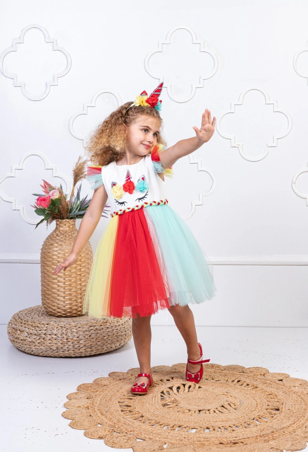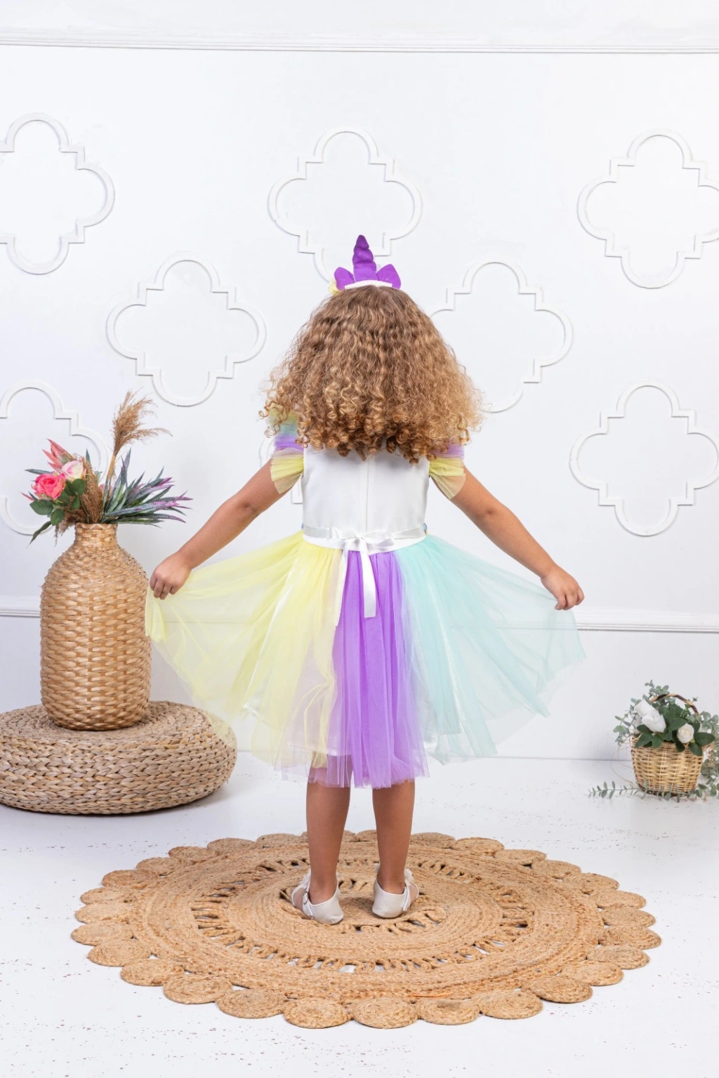 Kız çocukları için özel olarak tasarlanmış unicorn temalı tütülü elbise modeli. Üst kısmında unicorn figürü ve 3 boyutlu çiçek detayları yer alır. Etek kısmı hafif ve kabarık tül katmanlardan oluşur. Rahat kalıbı sayesinde doğum günü, parti, fotoğraf çekimi, okul gösterisi ve özel günlerde keyifle kullanılabilir. Cilde yumuşak dokunuş sağlayan kumaşı sayesinde gün boyu konfor sunar.