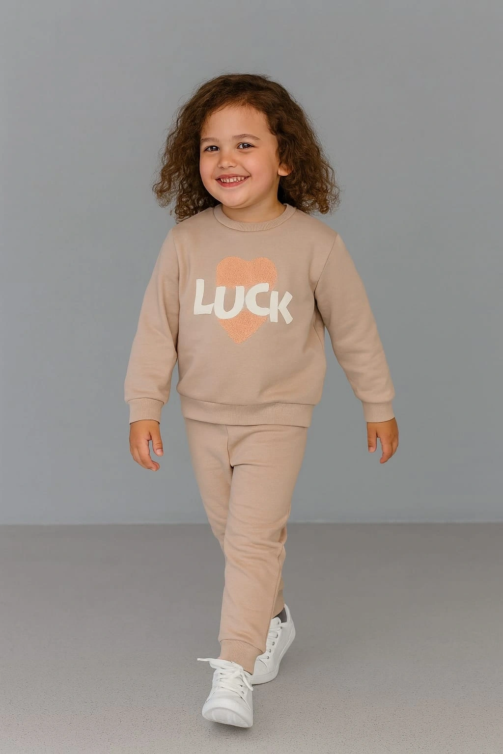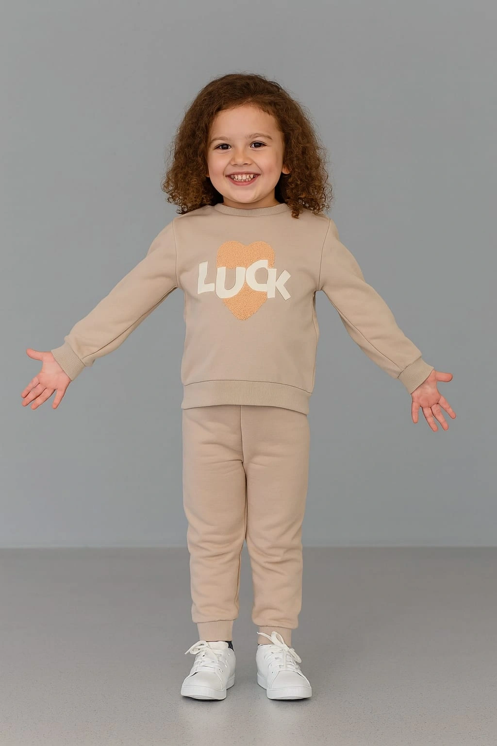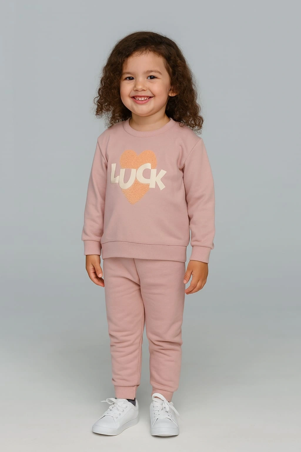 Miniklerin rahatlığı ve sevimliliği için tasarlanan bu eşofman takımı, %100 pamuk kumaşıyla yumuşacık bir dokunuş sunar. Günlük kullanım için ideal olan takım; esnek yapısı sayesinde hareket özgürlüğü sağlar. Üst kısmında yer alan kalp detayı ve “LUCK” yazısı, tasarıma modern bir dokunuş katarken alt kısmın sade formu kombin bütünlüğü oluşturur. Nefes alan kumaşıyla cilt dostudur, terletmez ve dört mevsim kullanılabilir.